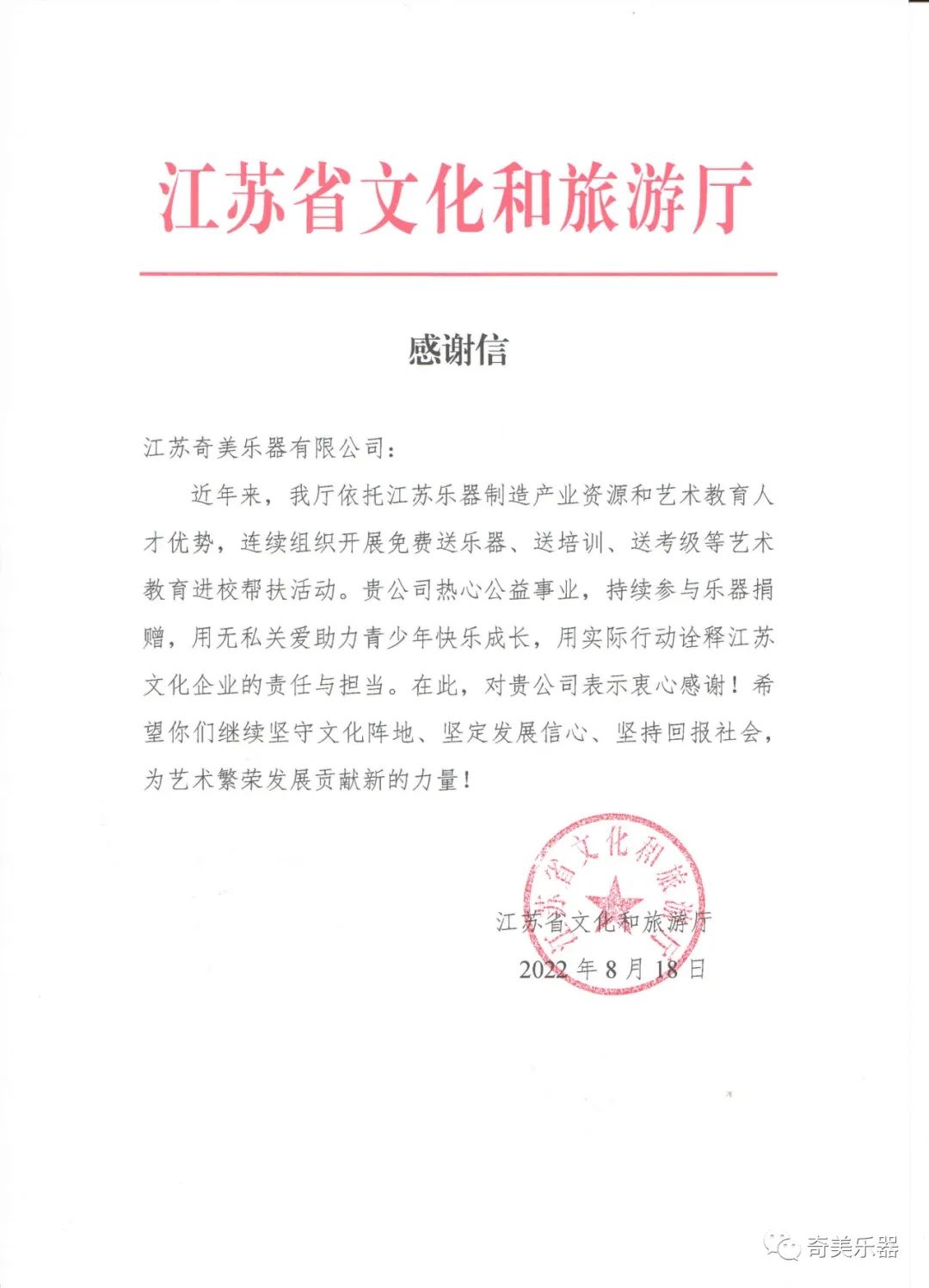 近日,奇美公司收到了來(lái)自江蘇省文化和旅游廳的感謝信,感謝奇美公司長(zhǎng)期以來(lái)對(duì)藝術(shù)教育扶貧工作的關(guān)心和支持。